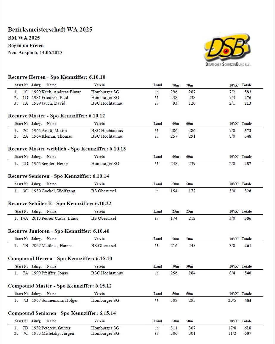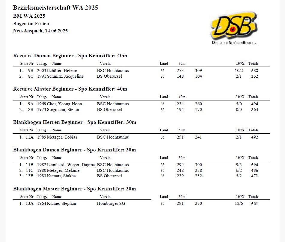 Dieses Jahr hat die Bezirksmeisterschaft auf unserem schönen Bogenplatz stattgefunden. Freunde und Schützen aus dem Bezirk 35 sind nach Neu-Anspach gekommen um bei wunderbarem Wetter die Qualifikation für die Landesmeisterschaft zu schießen.